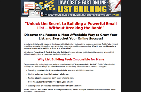 Introducing "Low Cost & Fast Online List Building"—your ultimate guide to rapidly growing an email list without wasting time or money on ineffective strategies.